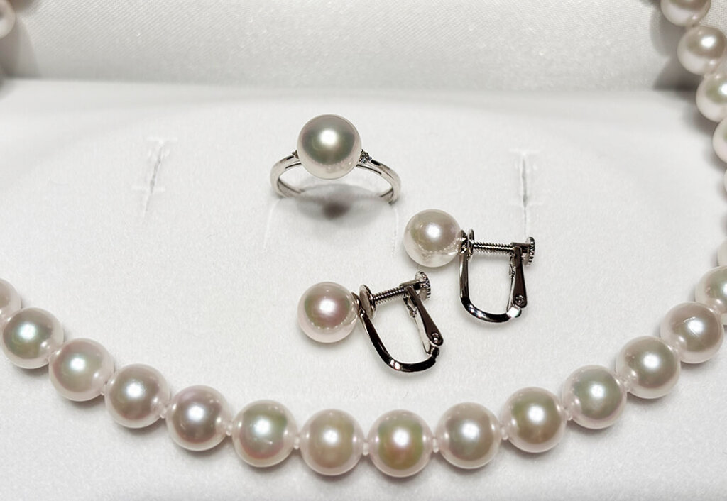 アコヤ真珠は養殖です、海で育てられるため気候や天候の影響を受けます。その為、自然界で育てられた証として真珠には「エクボ」と言われるものがございます。まずは店頭にて手に取りお客様自身の目でご覧いただきご確認くださいませ。清楚なイメージがあり、それぞれ別々でご活用いただくこともお勧めいたします。3点全て合わせてのセットアップは清楚なフォーマル使用になりますが、イヤリングのみやネックレス、リングとそれぞれTPOに合わせて楽しまれることもお勧めします。