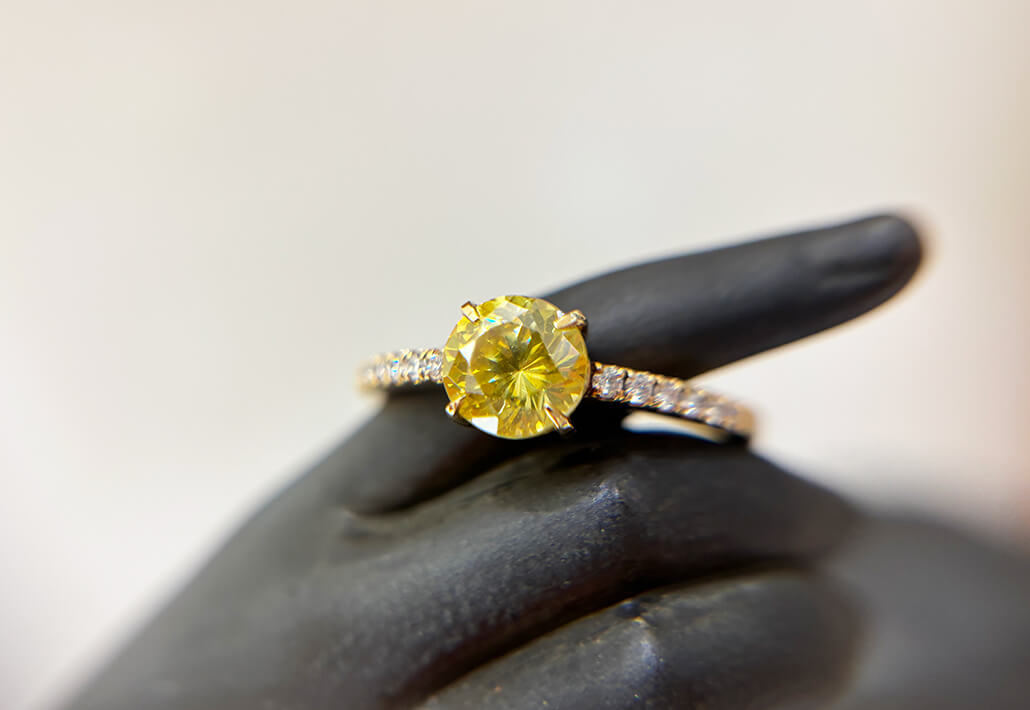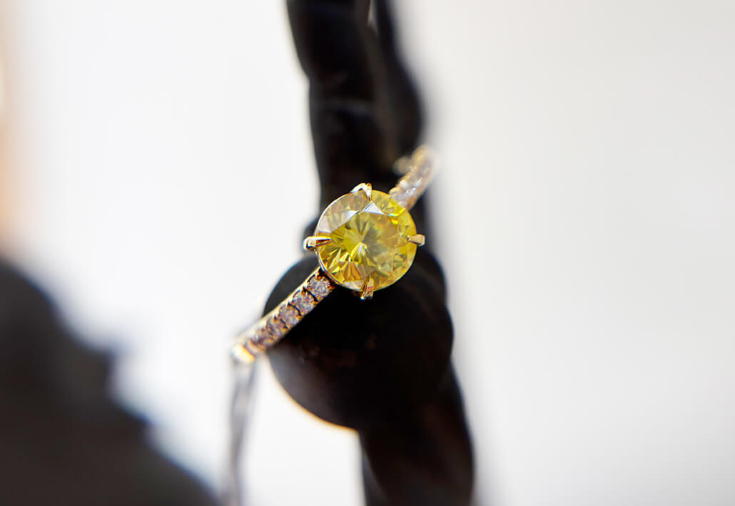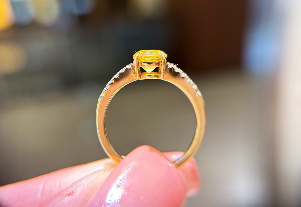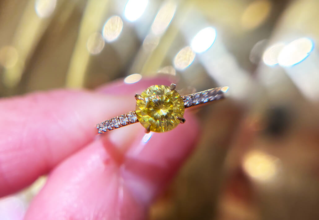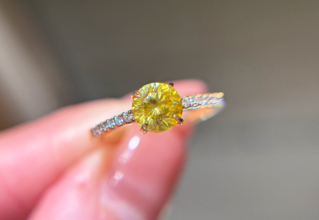 1カラットを越しイエロー系、光の加減で様々な方向からオレンジ、イエロー、グリーンの光が見受けられます。着けていくのは億劫になっても、見ている時間はあっという間です。観賞用としても非常に楽しめます。