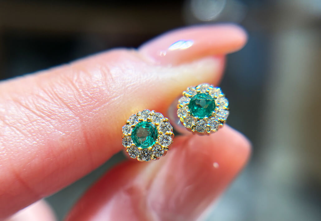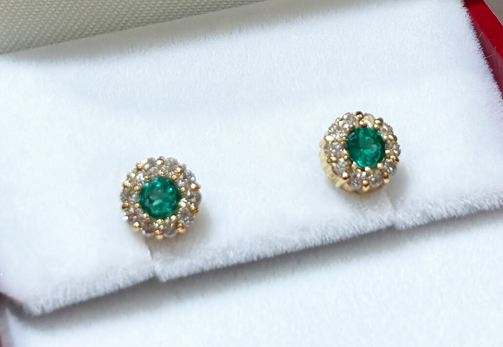 珍しくラウンドにカットされた「エメラルド」深みと照りのあるエメラルドが、良くぞ2ピースも揃い、贅沢にもピアスに仕上がってまいりました。エメラルドのリングやプチネックレスをお探しの方、すでにお持ちの方でも、ピアスをお探しの方多いようで必見です。