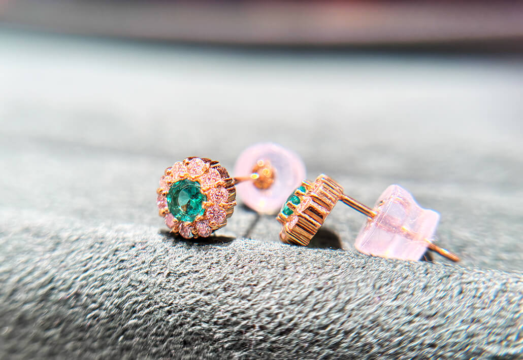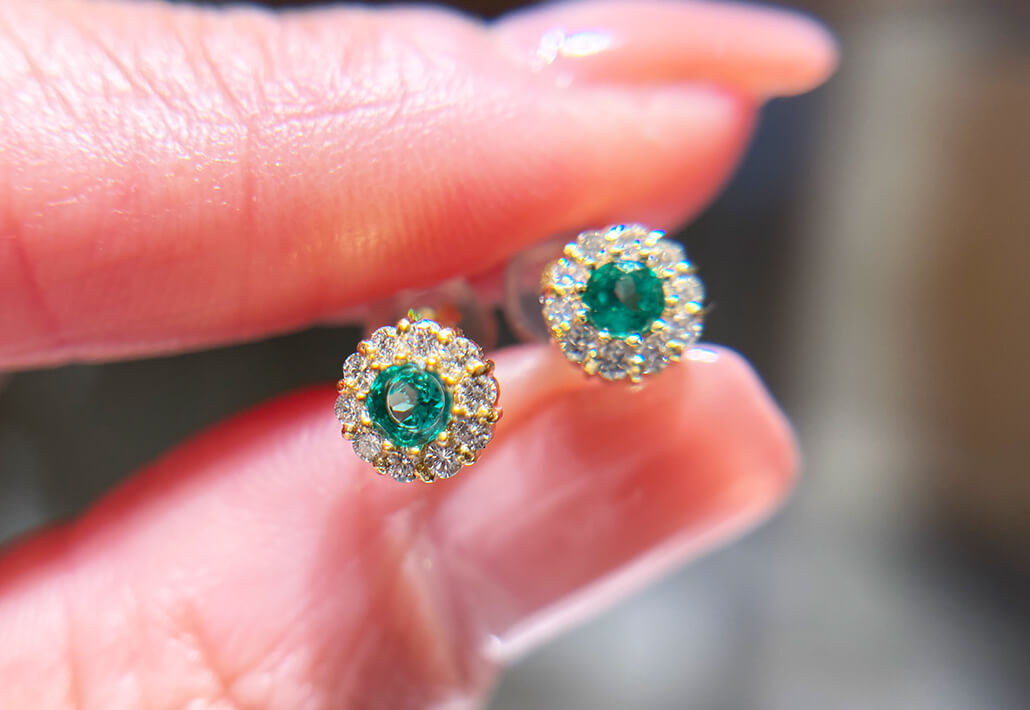エメラルドのしっかりとした色合い、引き立て役のダイヤモンドも煌めきとゴールド枠がよく合います。一見華やかなようですが、耳元でさりげなく煌めきラウンドのシルエットがフェミニンさを醸し出します。