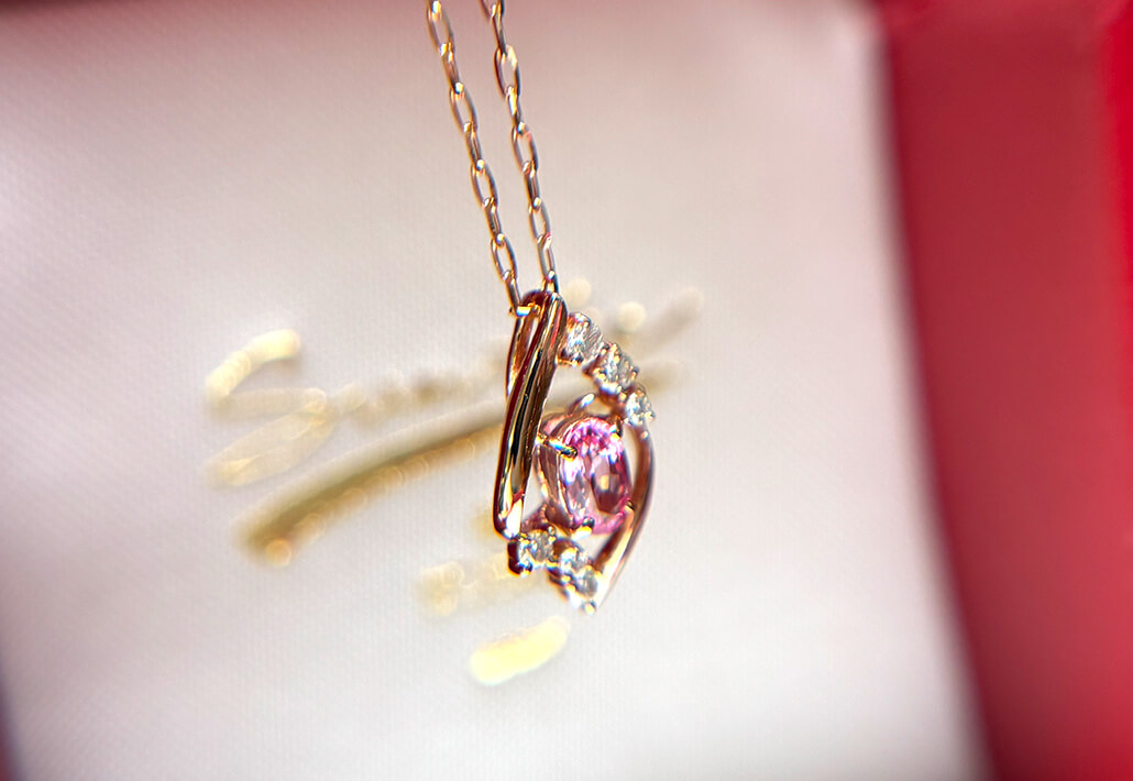 シンプルなピンクゴールドの枠に輝く「パパラチアサファイア」色濃くまるで花びらを連想させるデザインは、春先には勿論これからの季節にも温かみのあるピンクゴールドが柔らかなニット素材とも相性が良さそうです。