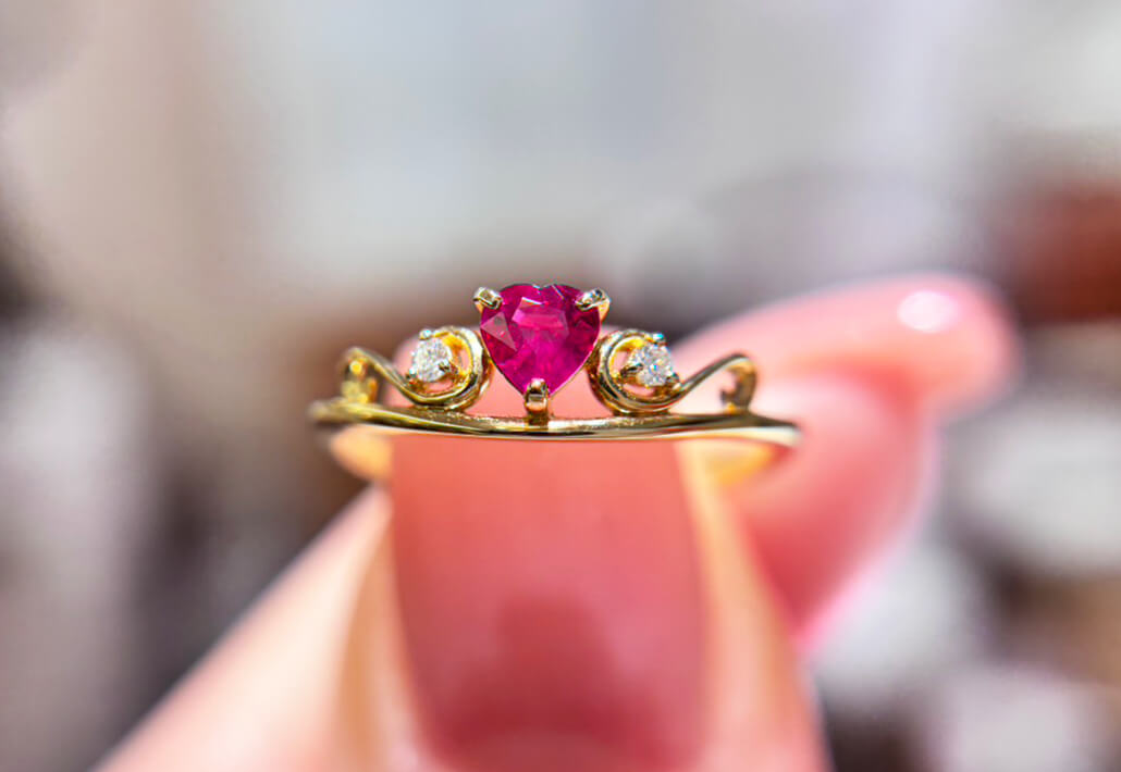 時代とともに赤い宝石は女性の守り石として身につけられるようになりました。中でも代表的なルビーは、力強い色、華やかな印象では有りますがハートシェイプのルビーとシンプルなゴールドのティアラモチーフがなんとも言えません。