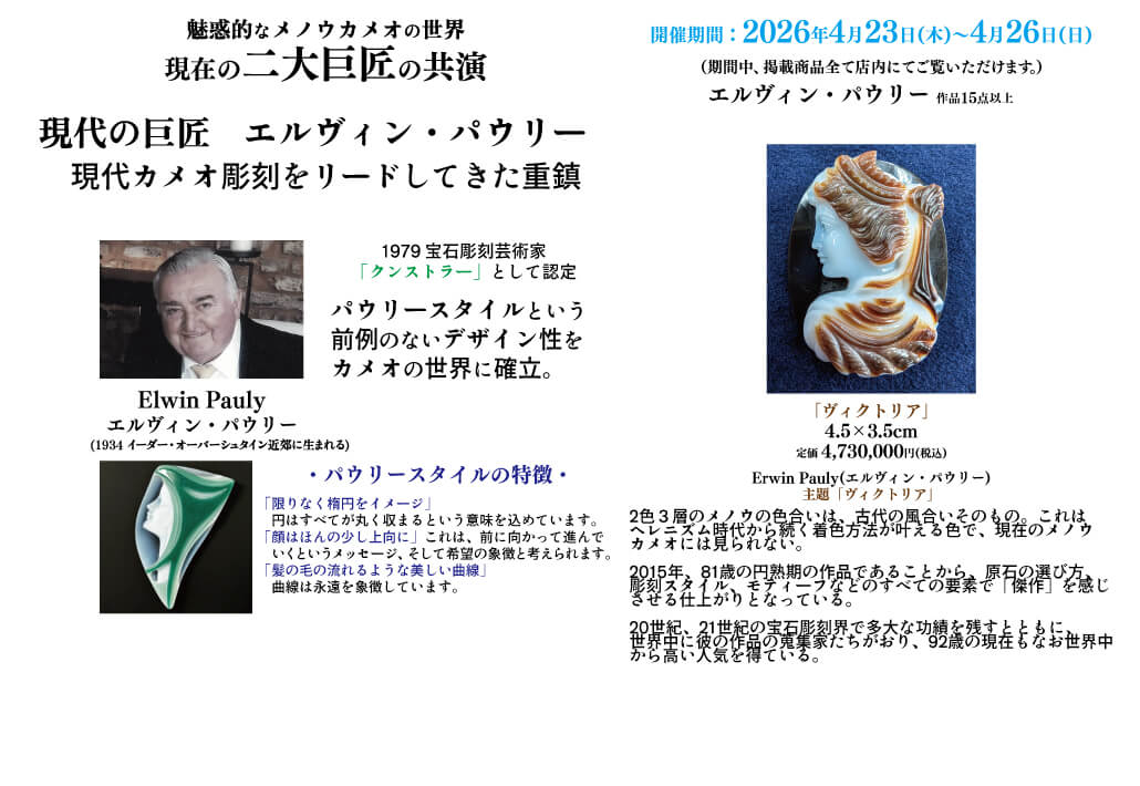 この度、世界最高峰のカメオ彫刻家ゲルハルド・シュミットと同じくクンストラーの称号をもつエルヴィン・パウリーの現在の二大巨匠の共演。